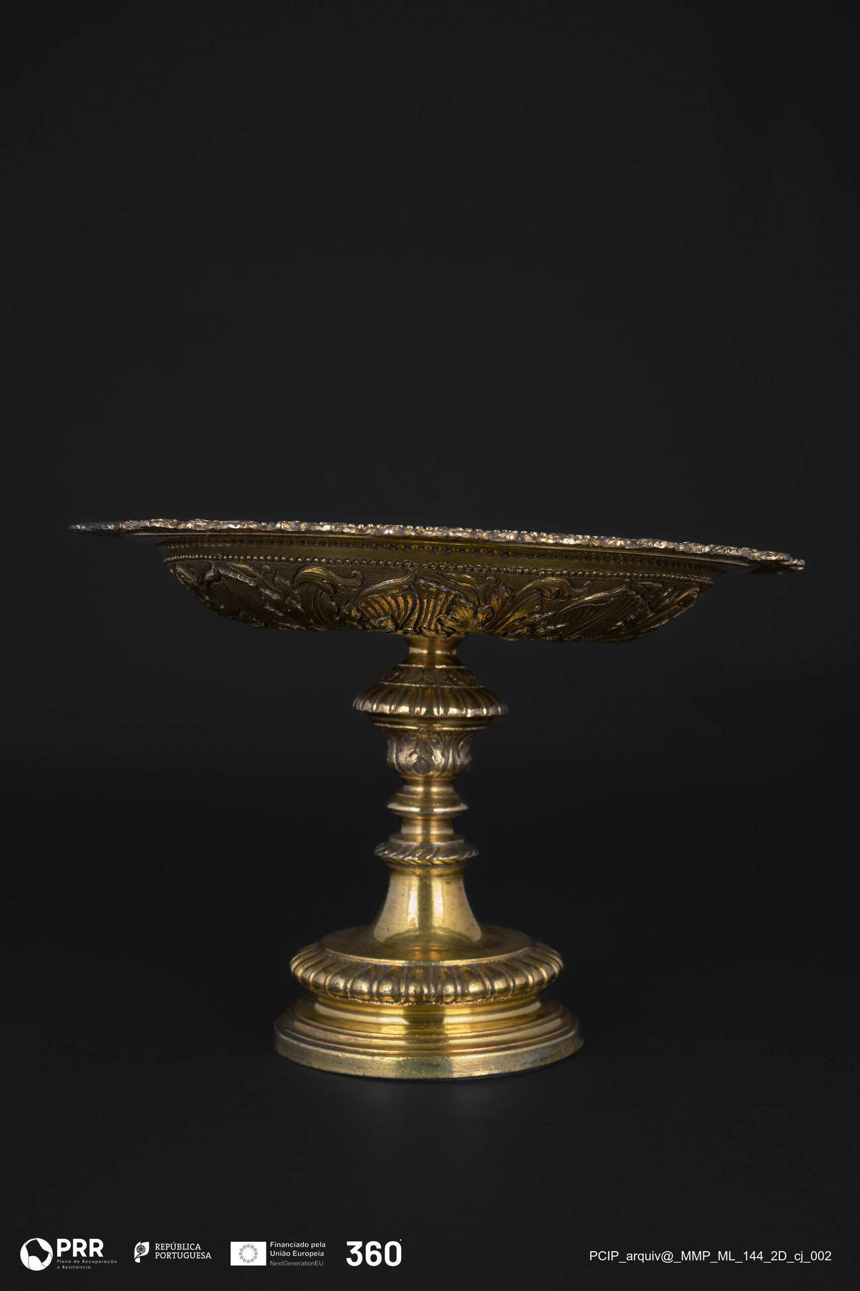 Matéria/Técnica: Dourada, relevada, incisa e recortada.; Cronologia: Século XV; Autoria: Desconhecida; Dimensões (cm): Altura: 14 x Diâmetro: 20,5; d.b.8,8.