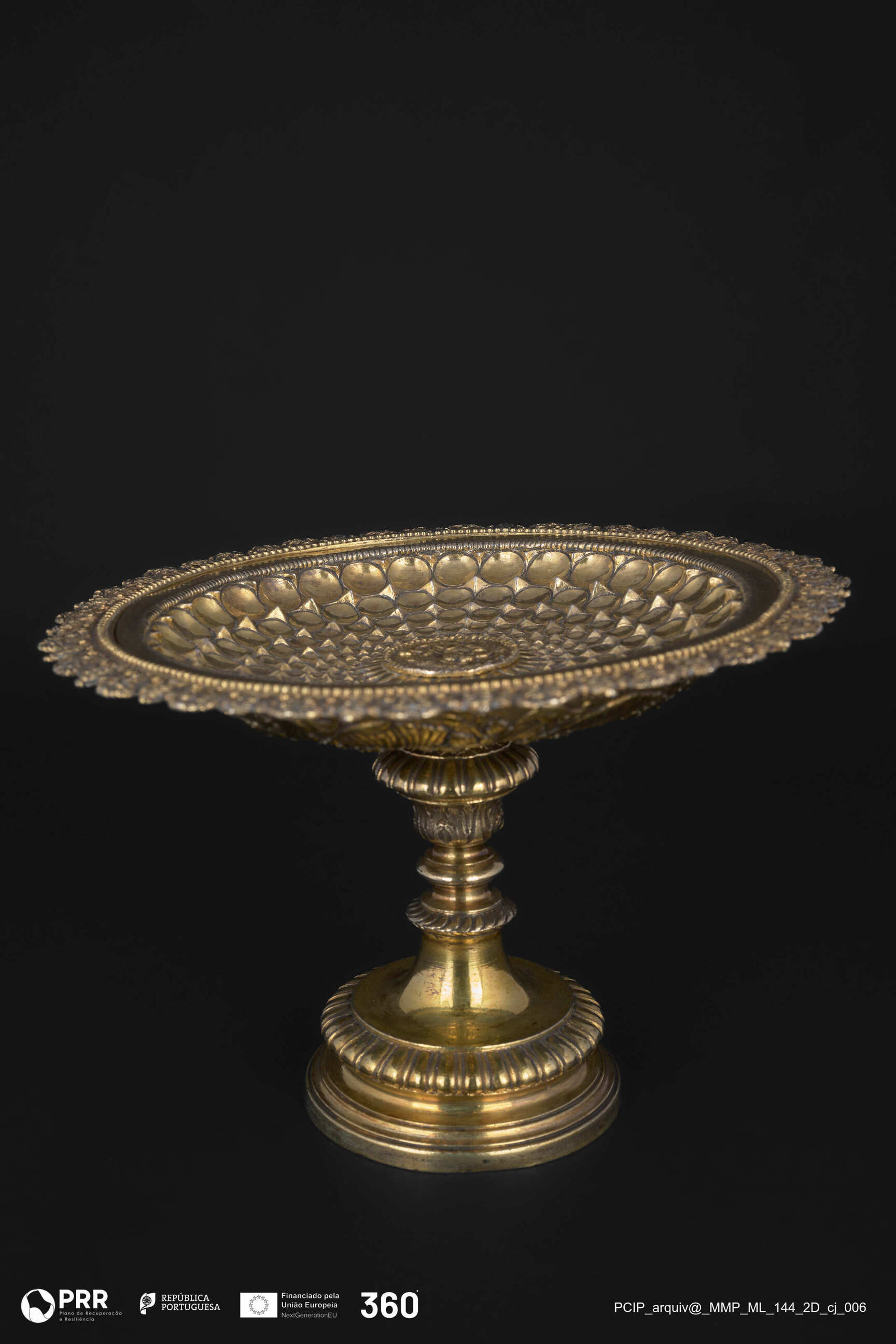 Matéria/Técnica: Dourada, relevada, incisa e recortada.; Cronologia: Século XV; Autoria: Desconhecida; Dimensões (cm): Altura: 14 x Diâmetro: 20,5; d.b.8,8.