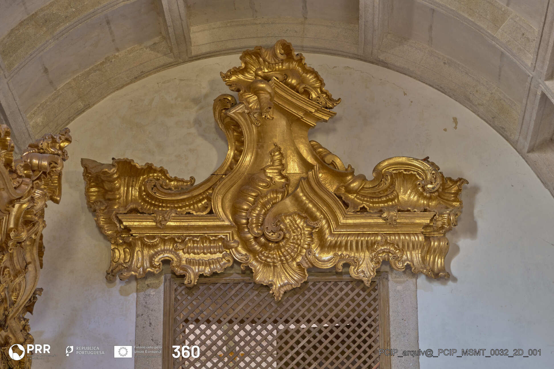 Matéria/Técnica: Madeira entalhada e dourada / Entalhamento e douramento; Cronologia: 1755-1758; Autoria: André Soares; Dimensões (cm): 125 x 312 x 58.