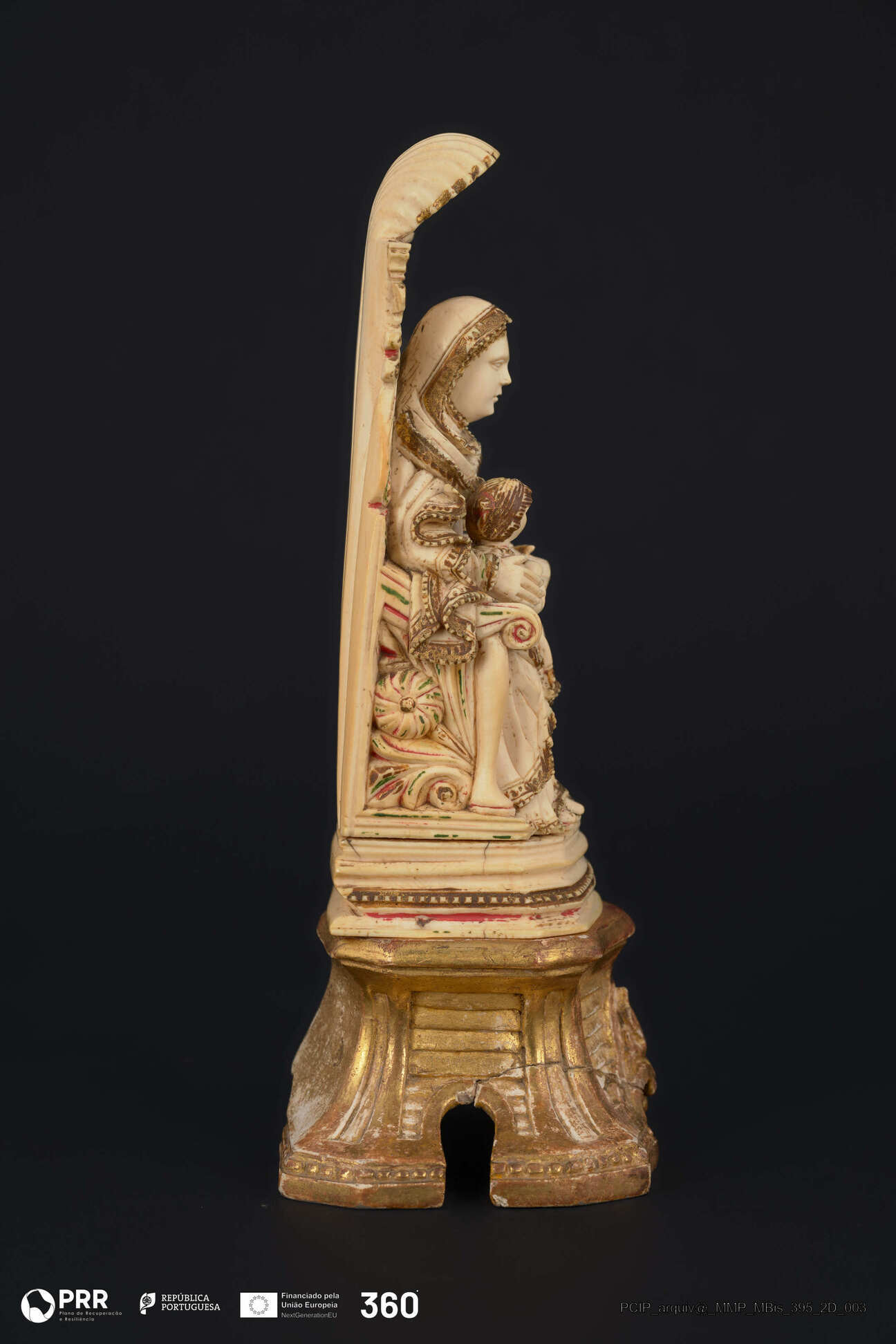 Matéria/Técnica: Marfim esculpido; madeira entalhada e estofada; prata fundida e repuxada; Cronologia: Desconhecida; Autoria: Artífice de escultura em marfim do sub-continente Indiano; Encomenda ocidental e execução Indo-Portuguesa; Dimensões: Desconhecidas.