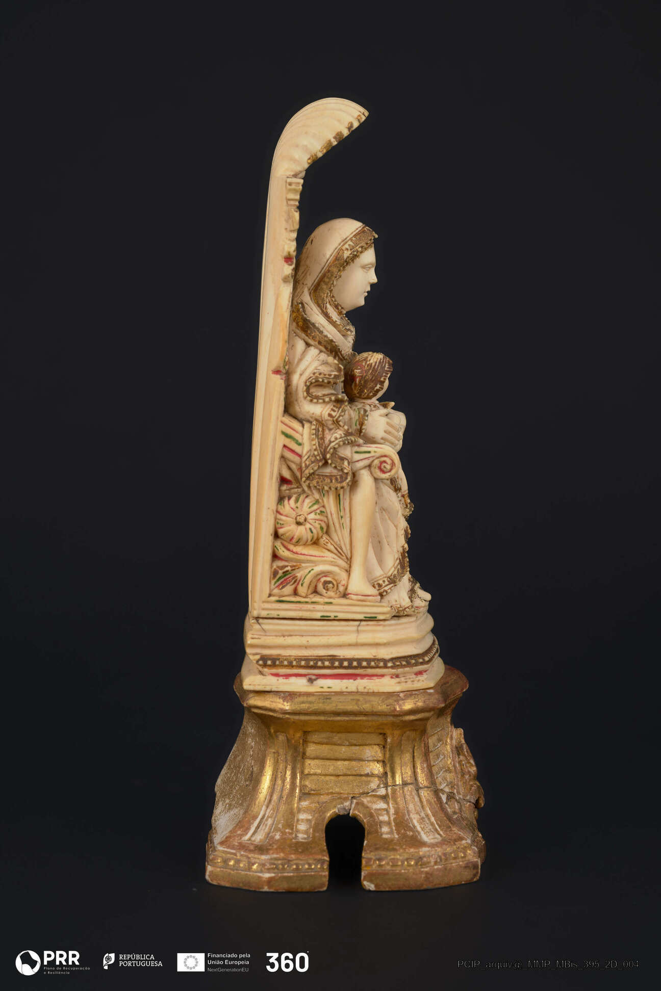 Matéria/Técnica: Marfim esculpido; madeira entalhada e estofada; prata fundida e repuxada; Cronologia: Desconhecida; Autoria: Artífice de escultura em marfim do sub-continente Indiano; Encomenda ocidental e execução Indo-Portuguesa; Dimensões: Desconhecidas.
