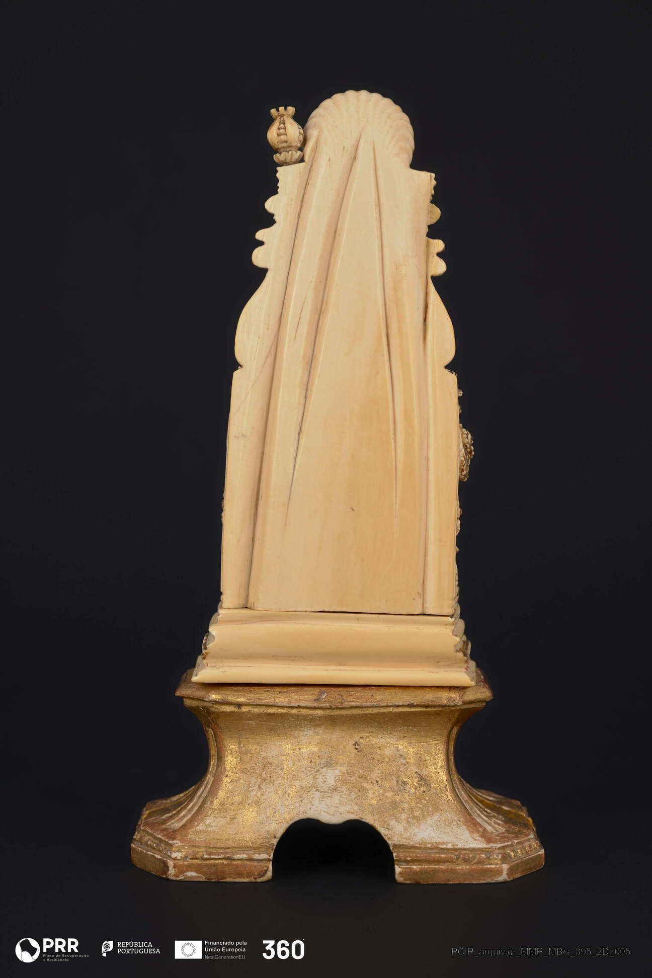 Matéria/Técnica: Marfim esculpido; madeira entalhada e estofada; prata fundida e repuxada; Cronologia: Desconhecida; Autoria: Artífice de escultura em marfim do sub-continente Indiano; Encomenda ocidental e execução Indo-Portuguesa; Dimensões: Desconhecidas.