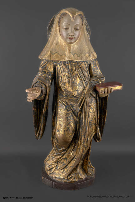 Matéria/Técnica: Escultura entalhada, dourada e estofada; Cronologia: Séculos XVII - XVIII; Autoria: Desconhecida; Dimensões (cm): Altura: 93 x Largura: 47 x Profundidade: 26.