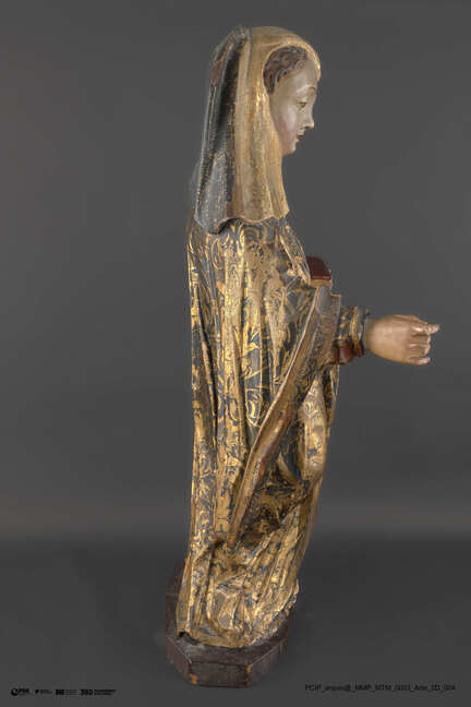 Matéria/Técnica: Escultura entalhada, dourada e estofada; Cronologia: Séculos XVII - XVIII; Autoria: Desconhecida; Dimensões (cm): Altura: 93 x Largura: 47 x Profundidade: 26.