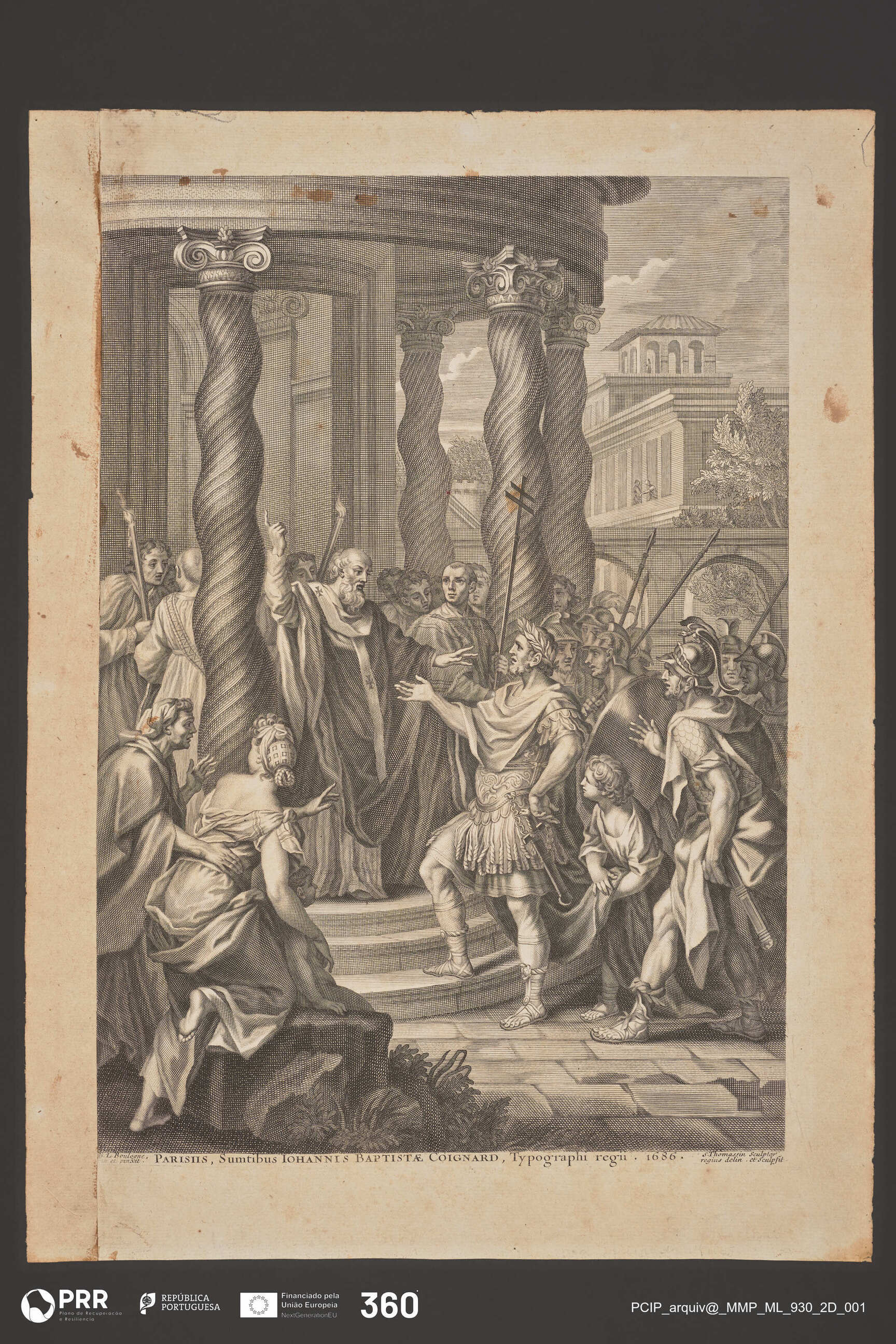 Matéria/Técnica: Gravura impressa sobre papel; Cronologia: 1686; Autoria: Boulogne, B. L. (desenho de); Thomassin, S.; Dimensões (cm): Altura: 34 x Largura: 24,5.