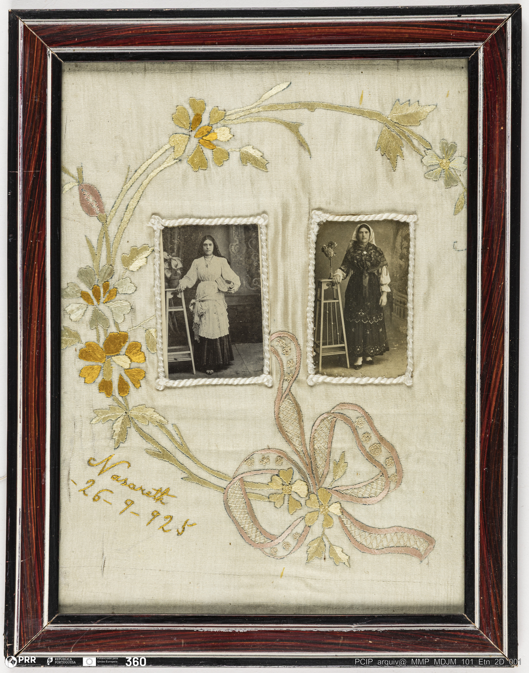 Matéria/Técnica: Seda (tecido); papel fotográfico (duas fotografias). Ponto cheio; Cronologia: 1925; Autoria: Deolinda Sousinha; Dimensões: Altura: 37,5 cm x Largura: 29 cm.
