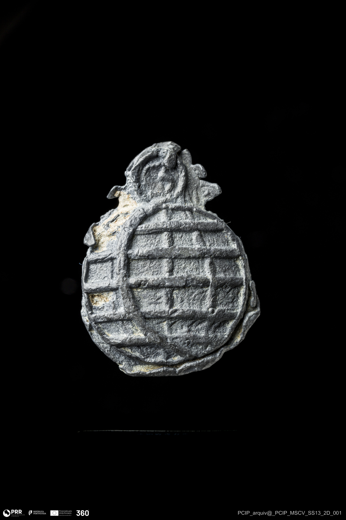 Matéria/Técnica: Chumbo; Cronologia: Indeterminada; Autoria: Desconhecida; Dimensões: Altura: 25,5mm; Largura: 20mm; Espessura: 7mm.