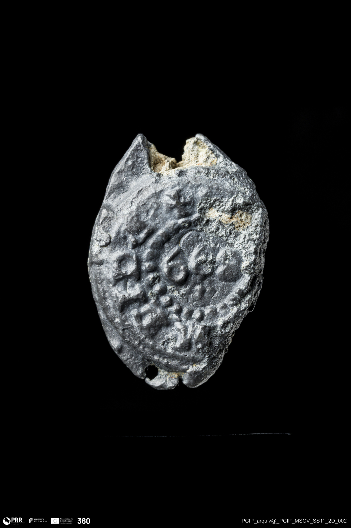 Matéria/Técnica: Chumbo; Cronologia: Indeterminada; Autoria: Desconhecida; Dimensões: Comprimento: 22,5mm; Largura: 15,5mm; Espessura: 6mm.