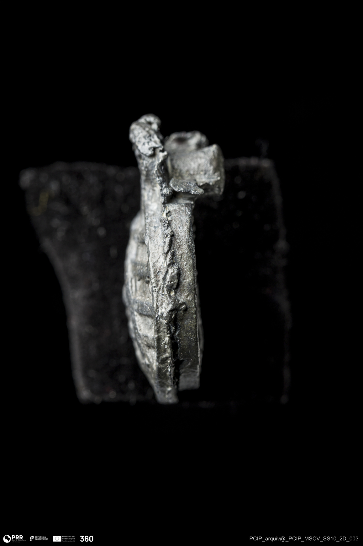 Matéria/Técnica: Chumbo; Cronologia: Indeterminada; Autoria: Desconhecida; Dimensões: Altura: 25,8mm; Largura: 21mm; Espessura: 7mm .