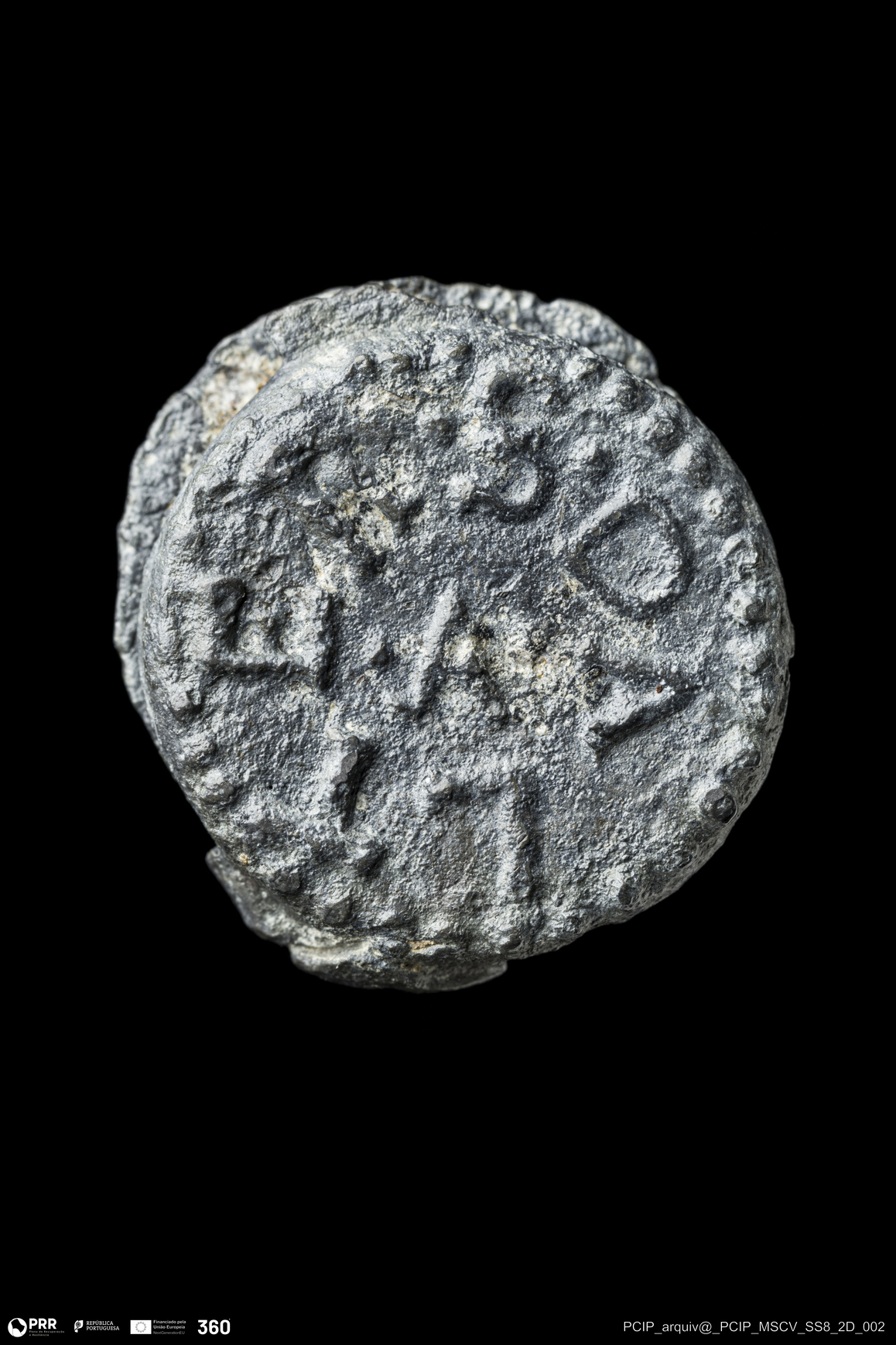 Matéria/Técnica: Chumbo; Cronologia: Indeterminada; Autoria: Desconhecida; Dimensões: Altura: 25mm; Largura: 23mm; Espessura: 6,5mm.