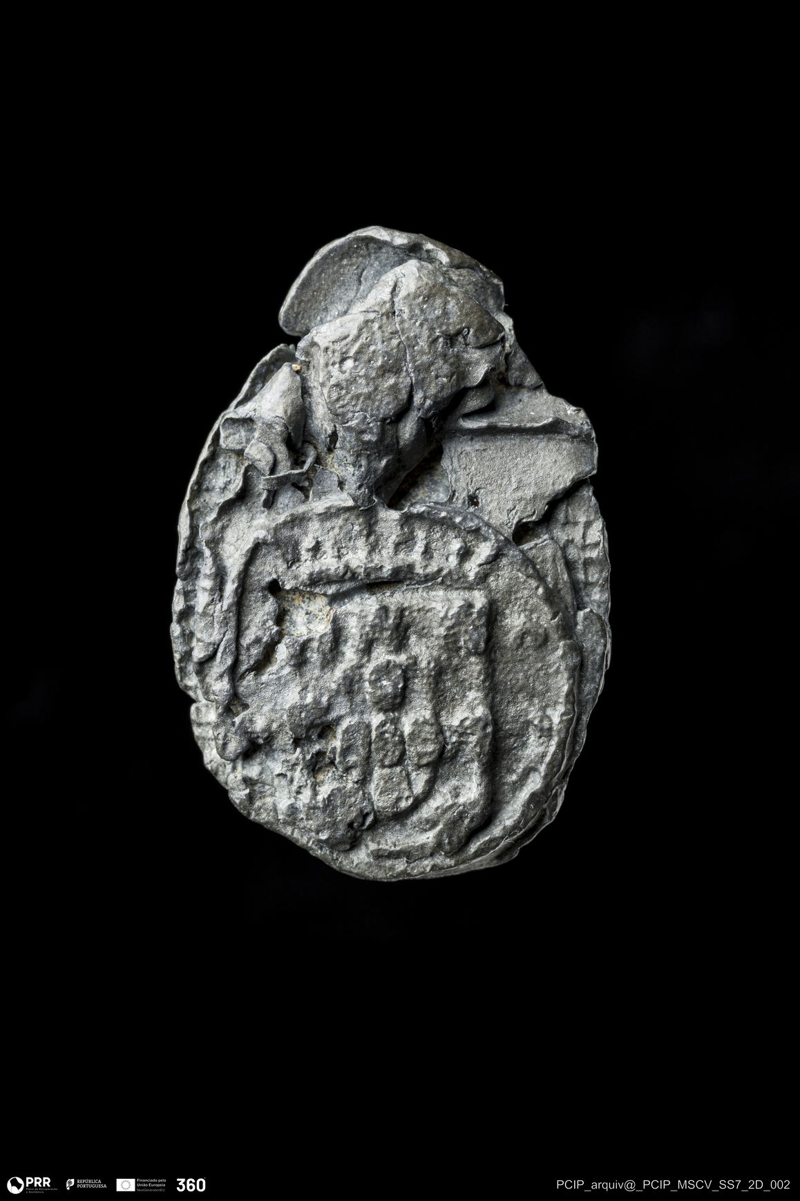 Matéria/Técnica: Chumbo; Cronologia: Indeterminada; Autoria: Desconhecida; Dimensões: Comprimento: 30mm; Largura: 20mm; Espessura: 6mm.