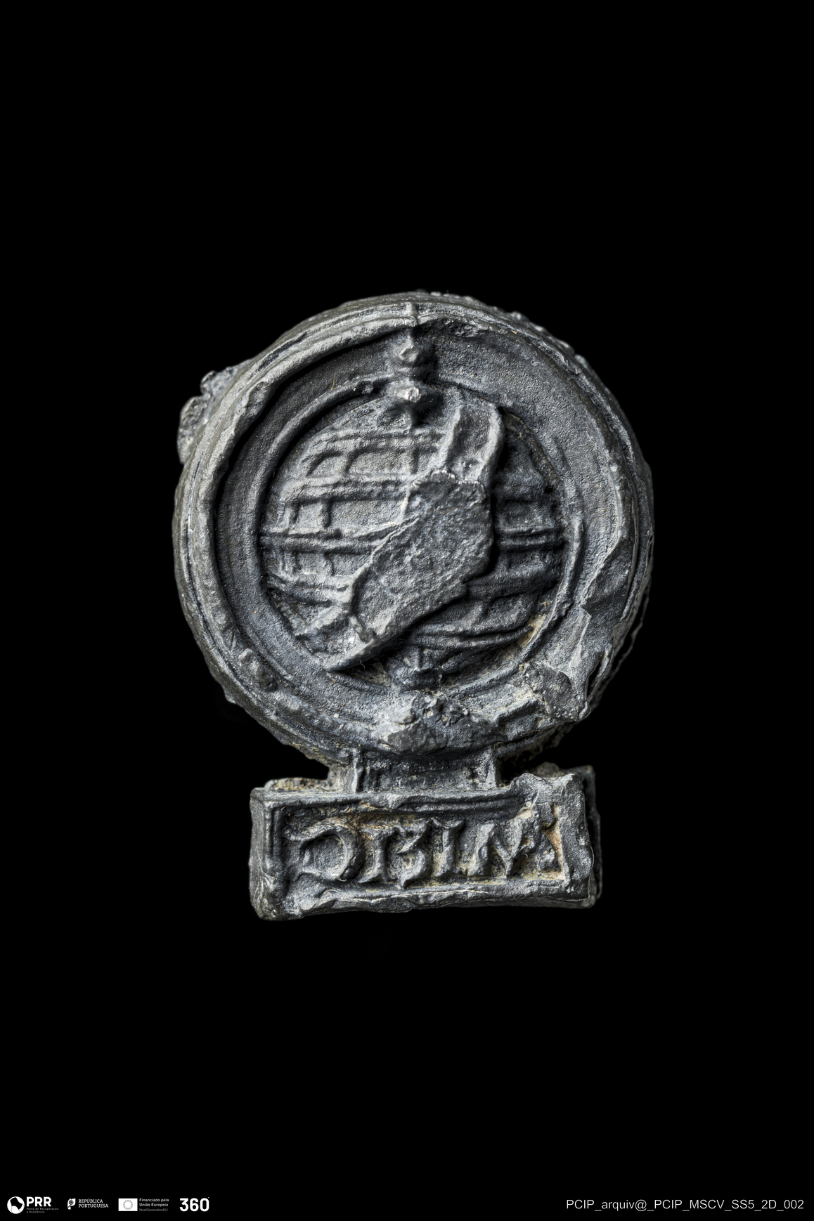 Matéria/Técnica: Chumbo; Cronologia: Indeterminada; Autoria: Desconhecida; Dimensões: Altura: 23mm;: Largura: 18mm; Espessura: 8mm.
