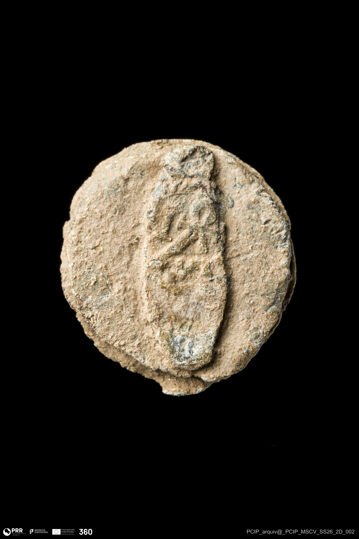 Matéria/Técnica: Chumbo; Cronologia: Indeterminada; Autoria: Desconhecida; Dimensões: Comprimento: 19mm; Largura: 17mm; Espessura: 4mm.