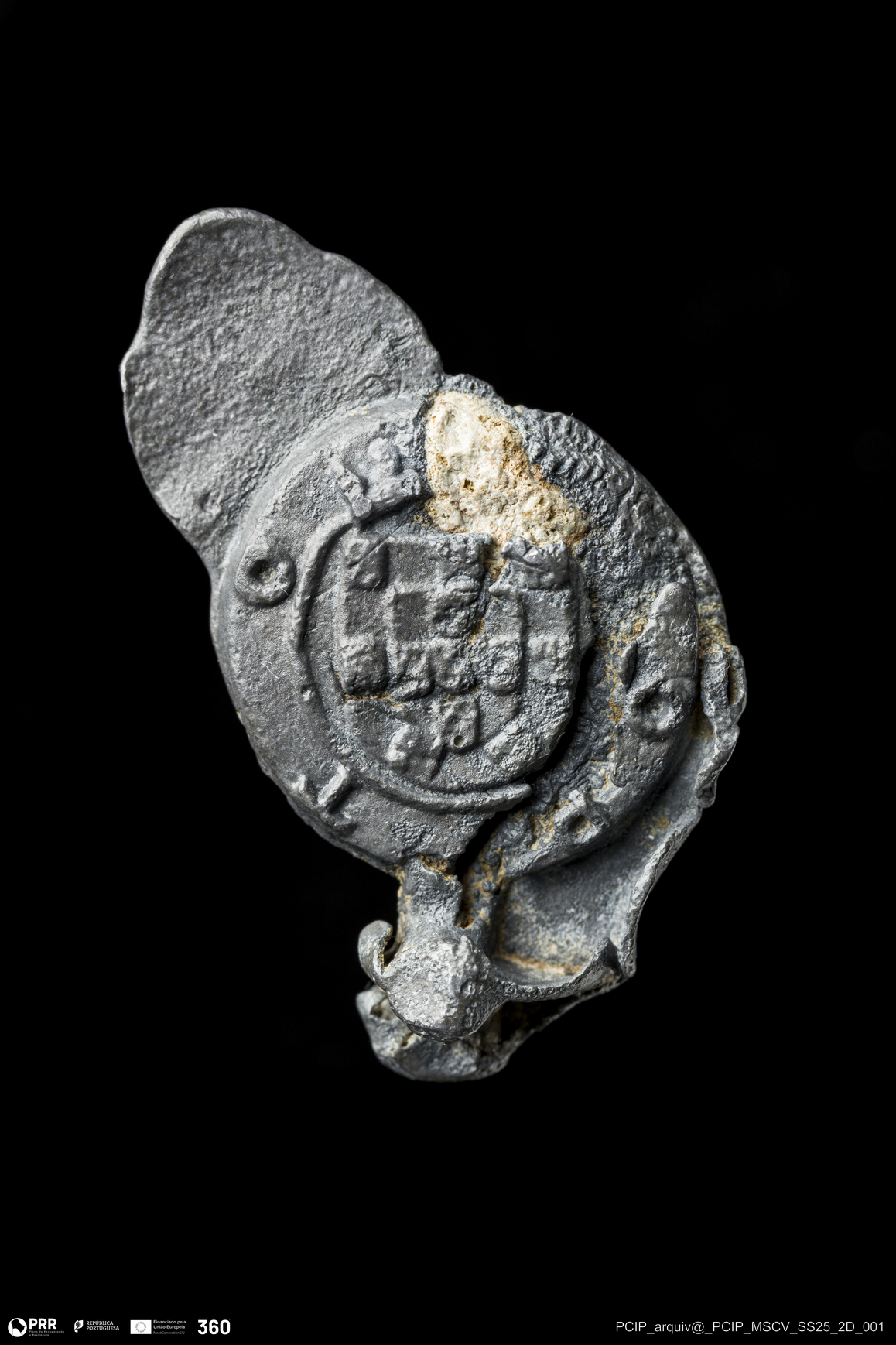 Matéria/Técnica: Chumbo; Cronologia: Indeterminada; Autoria: Desconhecida; Dimensões: Altura: 38mm; Largura: 21,5mm; Espessura: 8,5mm.