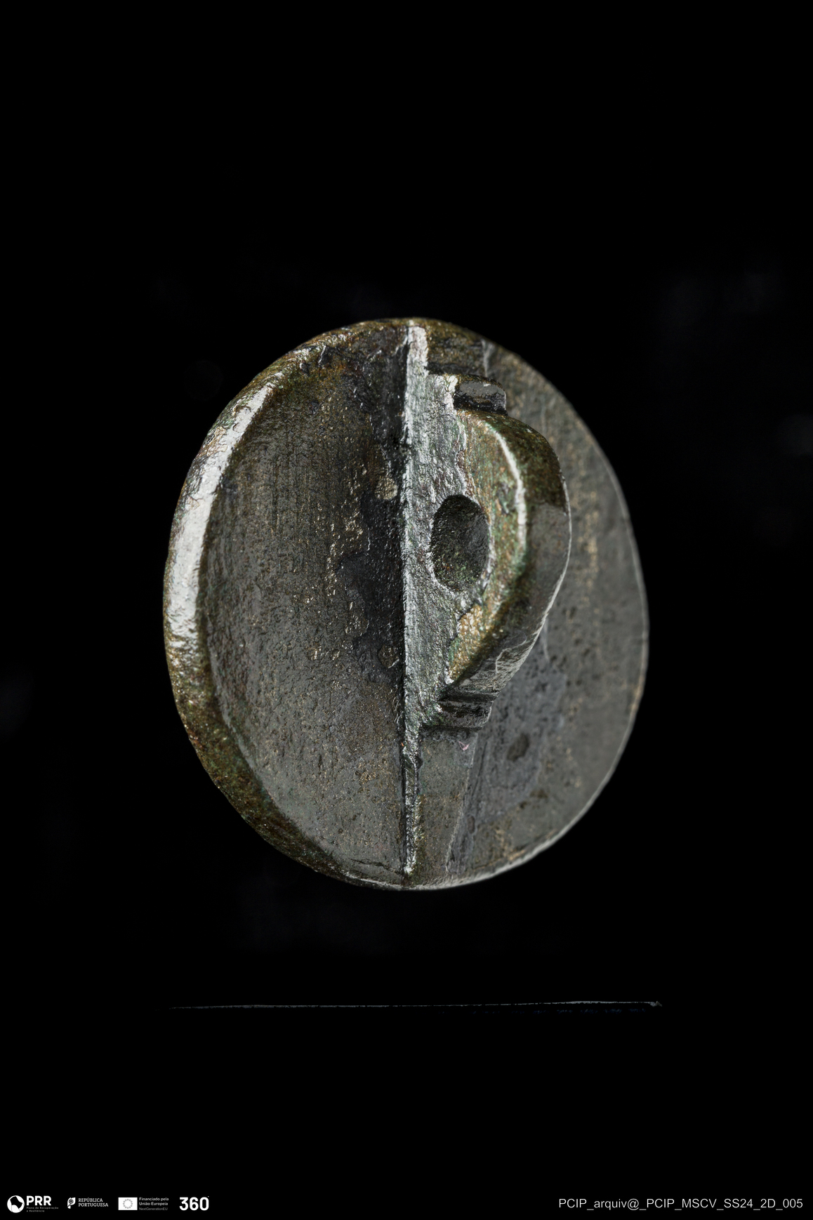 Matéria/Técnica: Chumbo; Cronologia: Indeterminada; Autoria: Desconhecida; Dimensões: Comprimento: 14mm; Largura: 14mm; Espessura: 11mm.