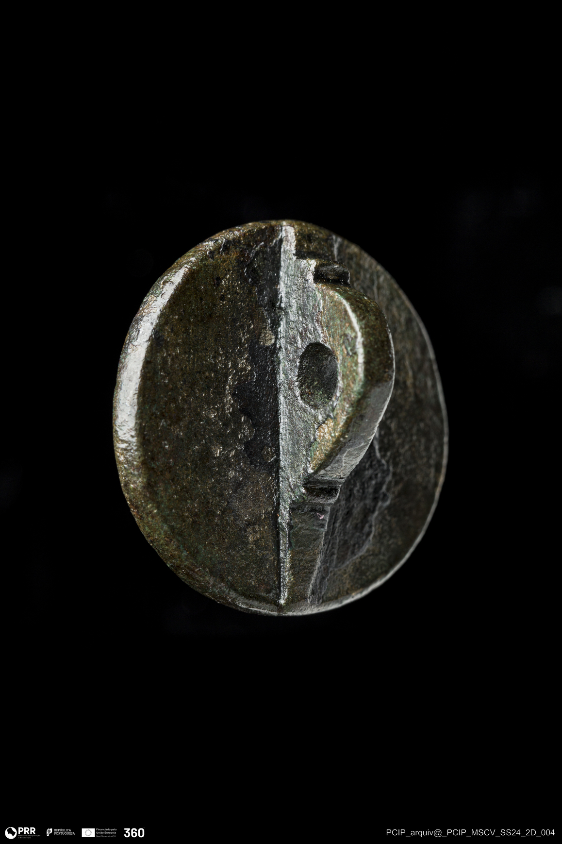 Matéria/Técnica: Chumbo; Cronologia: Indeterminada; Autoria: Desconhecida; Dimensões: Comprimento: 14mm; Largura: 14mm; Espessura: 11mm.