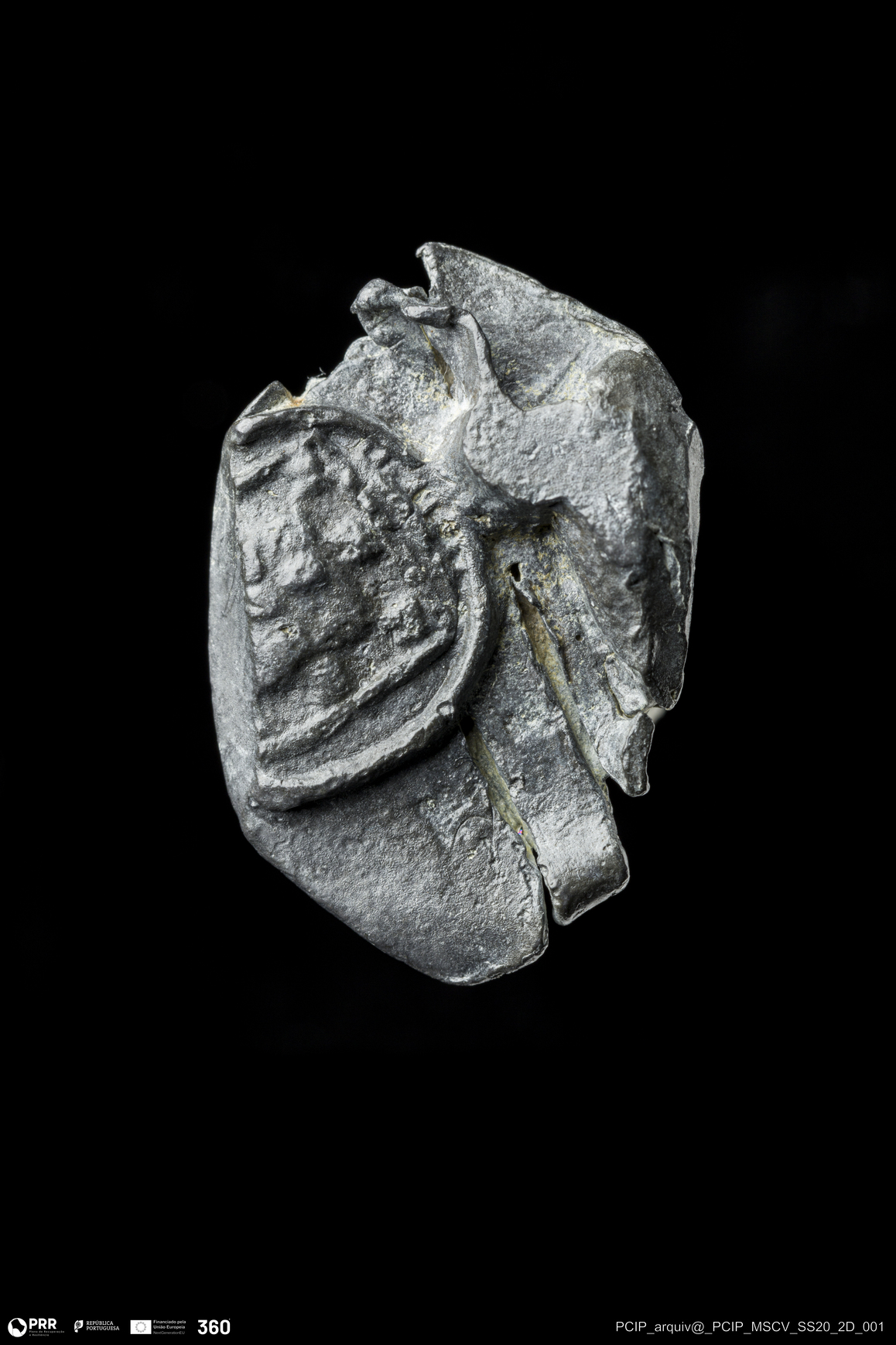 Matéria/Técnica: Chumbo; Cronologia: Indeterminada; Autoria: Desconhecida; Dimensões: Comprimento: 25,5mm; Largura: 17mm; Espessura: 7mm.