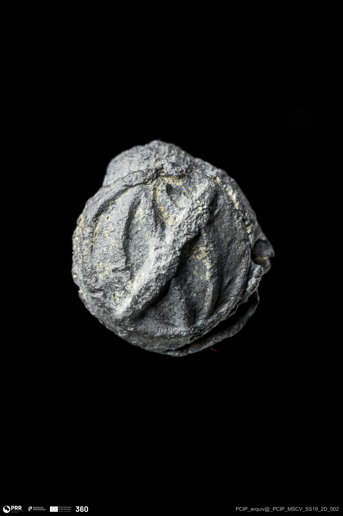 Matéria/Técnica: Chumbo; Cronologia: Indeterminada; Autoria: Desconhecida; Dimensões: Comprimento: 19mm; Largura: 18mm; Espessura: 9mm.