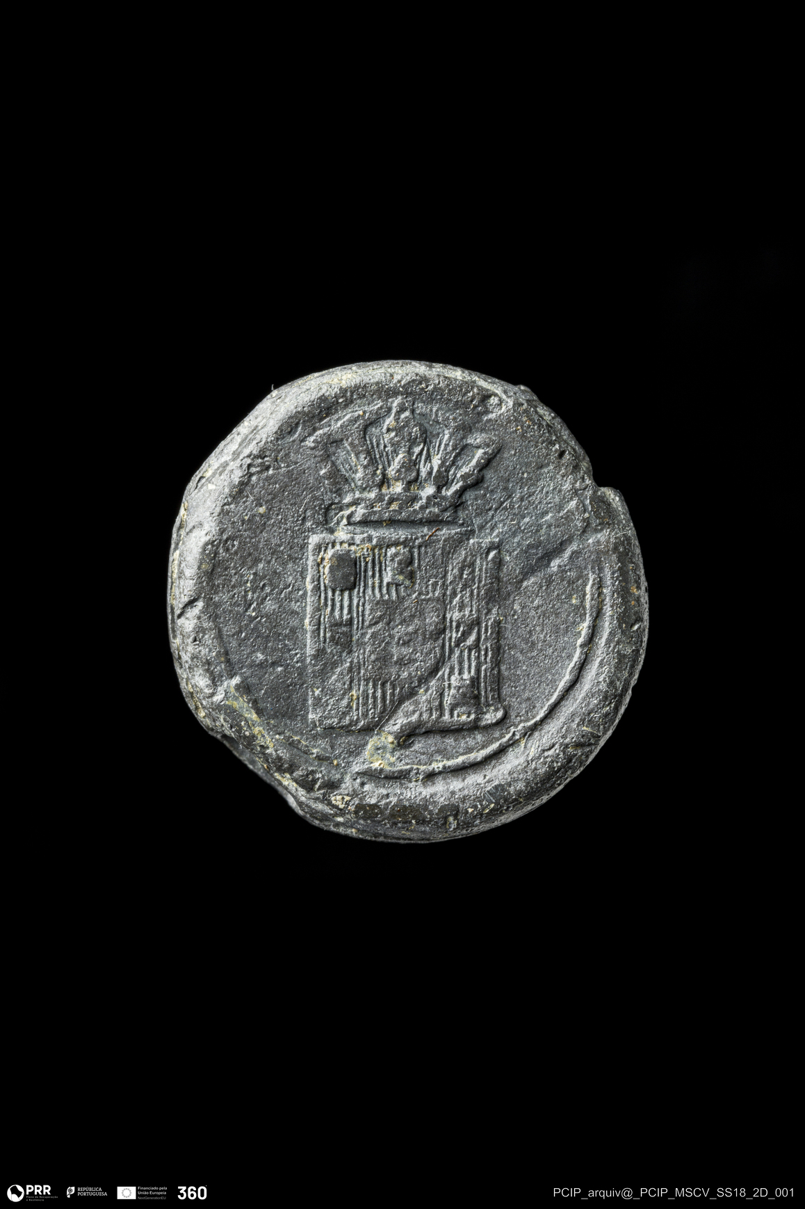 Matéria/Técnica: Chumbo; Cronologia: Indeterminada; Autoria: Desconhecida; Dimensões: Comprimento: 19mm; Largura: 19mm; Espessura: 4mm.