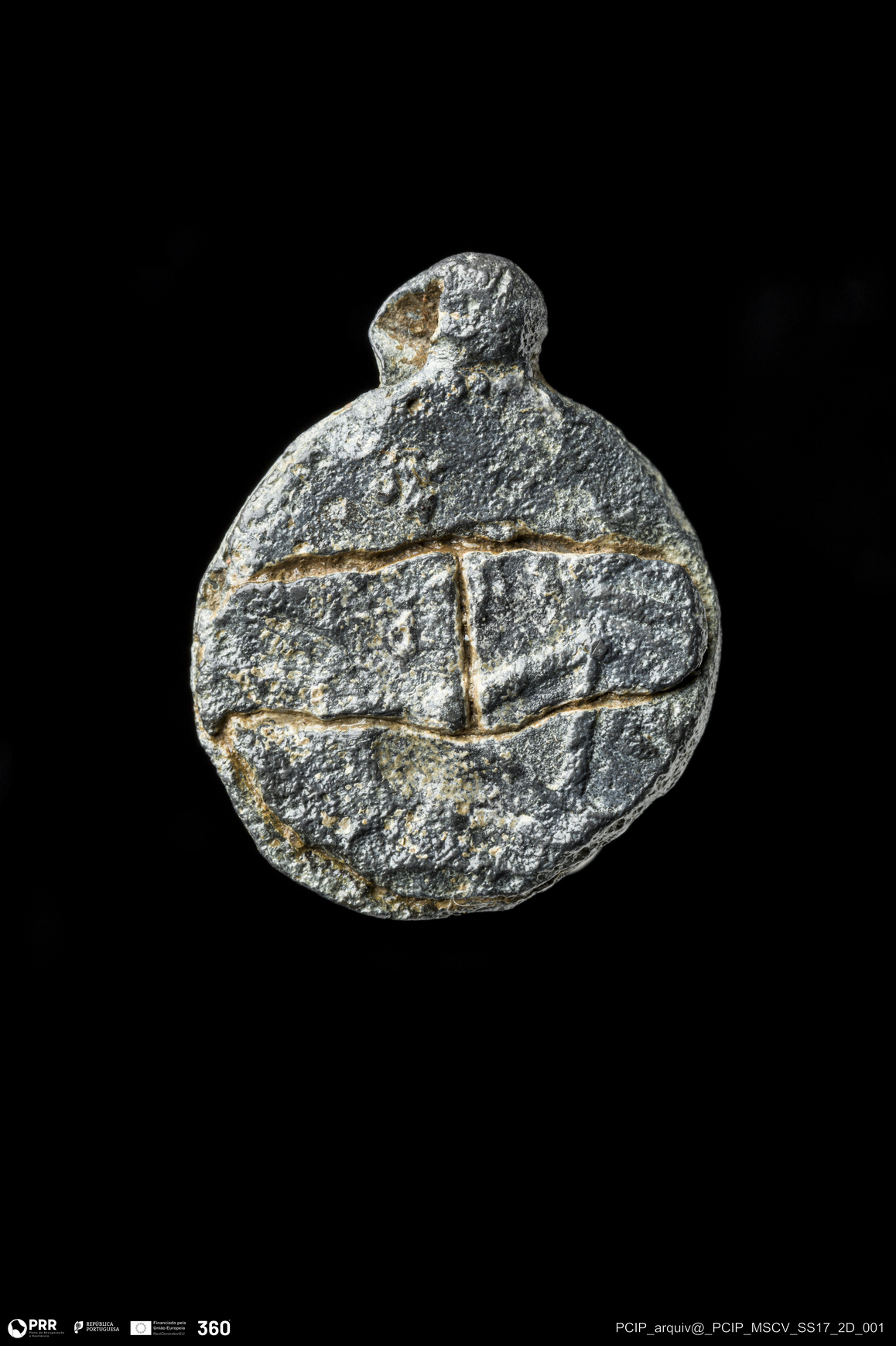 Matéria/Técnica: Chumbo; Cronologia: Indeterminada; Autoria: Desconhecida; Dimensões: Comprimento: 24mm; Largura: 19mm; Espessura: 4mm.