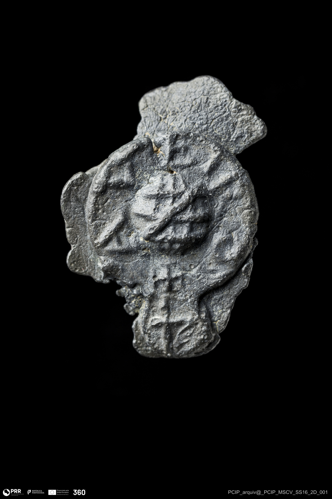 Matéria/Técnica: Chumbo; Cronologia: Indeterminada; Autoria: Desconhecida; Dimensões: Altura: 31mm; Largura: 22mm; Espessura: 7mm.