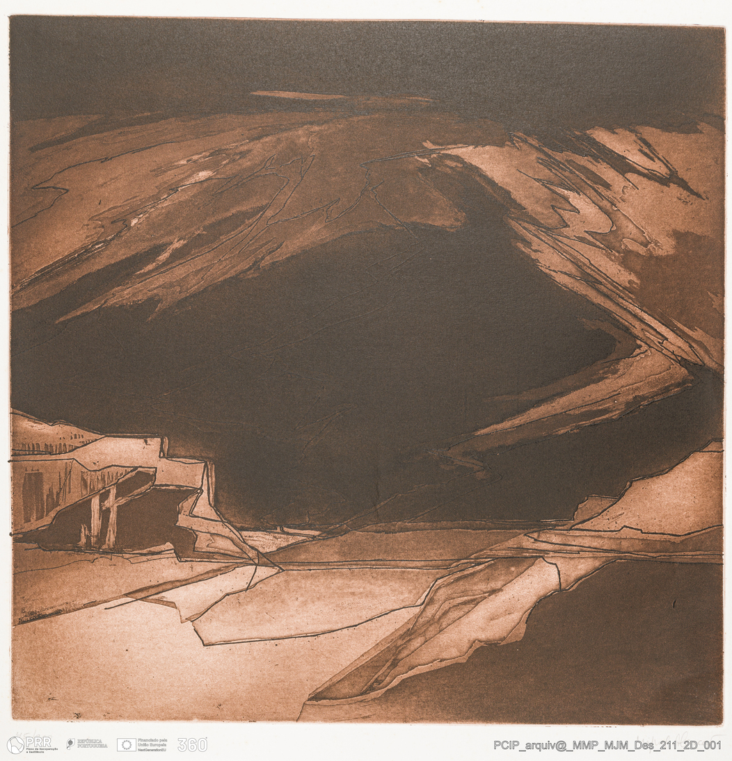Matéria/Técnica: Gravura; Cronologia: Desconhecida; Autoria: Miguel Alarcão; Dimensões: 70,5 x 62,5 cm.