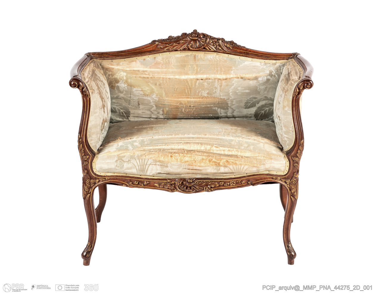 Matéria/Técnica: Madeira de nogueira; tecido de seda; Cronologia: Século XIX; Autoria: Desconhecida; Dimensões (cm): Altura: 74; Largura: 84; Comprimento: 49.
