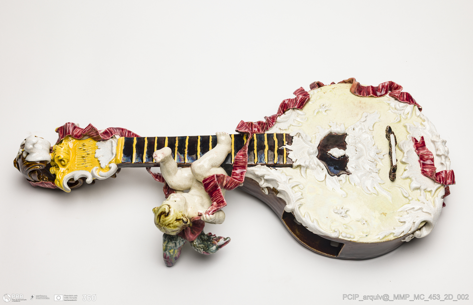 Matéria/Técnica: Barro vermelho moldado. Vidrado polícromo: camurça, castanho, vermelho e branco; Cronologia: 1892-1896; Autoria: Desconhecido / Atelier Cerâmica, Caldas da Rainha, Portugal; Dimensões (cm): Altura: 12; Largura: 57; Comprimento: 15.