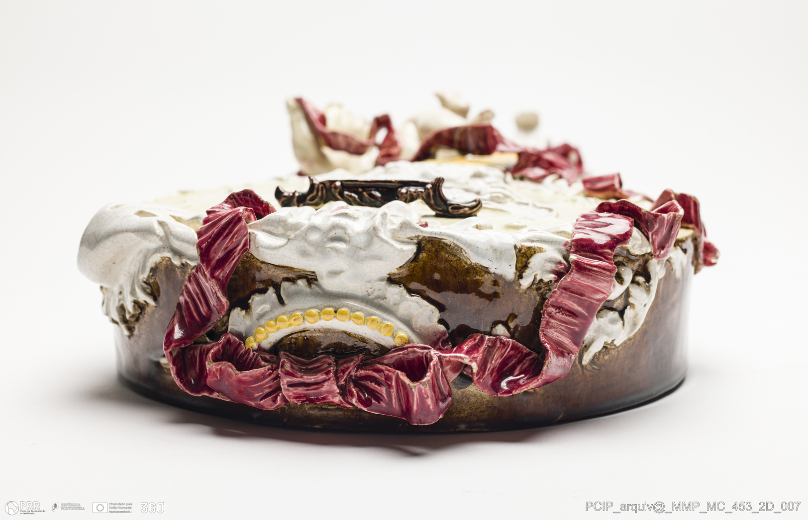 Matéria/Técnica: Barro vermelho moldado. Vidrado polícromo: camurça, castanho, vermelho e branco; Cronologia: 1892-1896; Autoria: Desconhecido / Atelier Cerâmica, Caldas da Rainha, Portugal; Dimensões (cm): Altura: 12; Largura: 57; Comprimento: 15.
