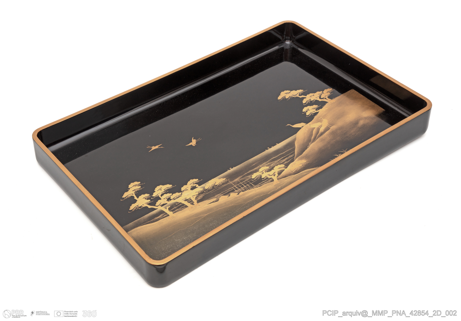 Matéria/Técnica: Madeira, laca; Cronologia: Século XIX; Autoria: Desconhecida; Dimensões (cm): Altura: 4,4; Largura: 46,5; Profundidade: 29,7.