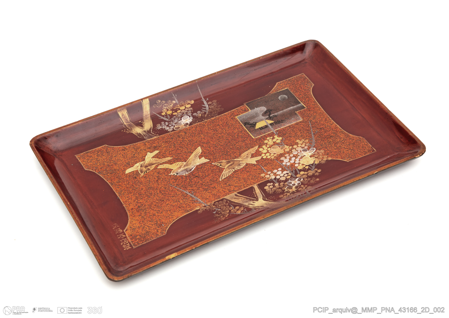 Matéria/Técnica: Madeira, laca; Cronologia: Século XIX; Autoria: Desconhecida; Dimensões (cm): Altura: 1,5; Largura: 26,5; Profundidade: 15,7.