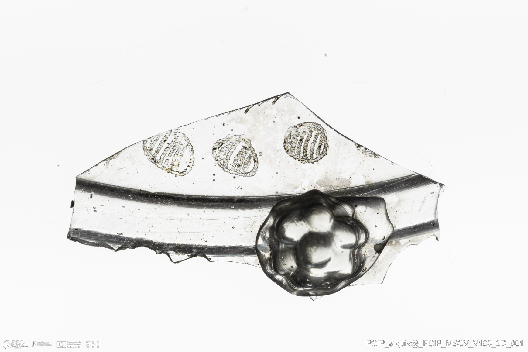 Matéria/Técnica: Vidro; Cronologia: Século XVII; Autoria: Desconhecida; Dimensões: Comprimento: 38mm; Largura: 20mm.
