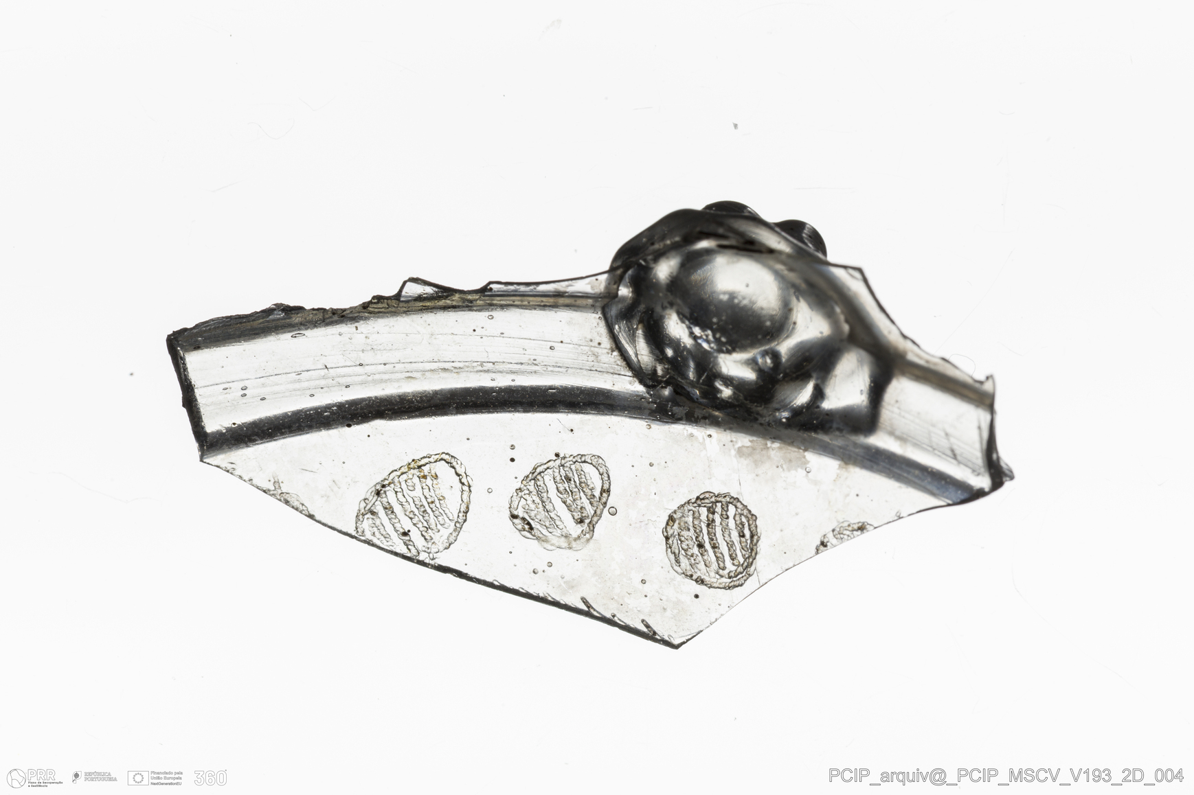 Matéria/Técnica: Vidro; Cronologia: Século XVII; Autoria: Desconhecida; Dimensões: Comprimento: 38mm; Largura: 20mm.