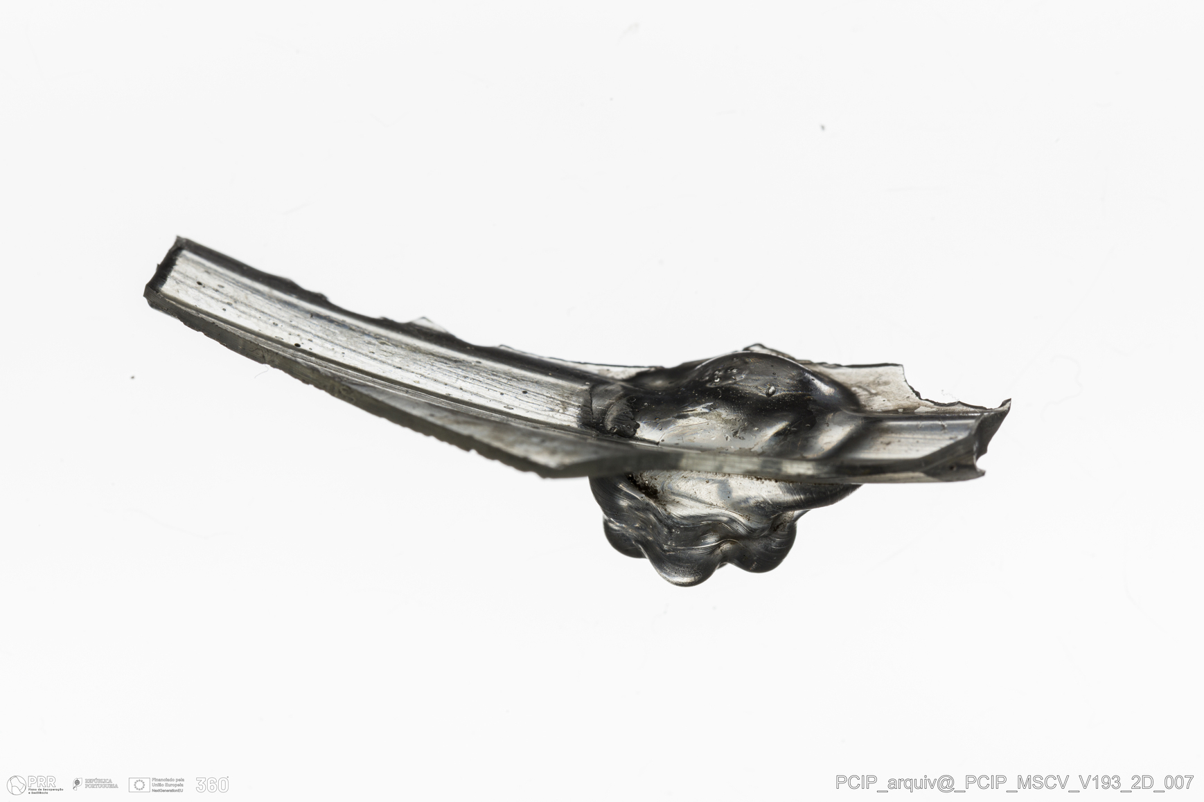 Matéria/Técnica: Vidro; Cronologia: Século XVII; Autoria: Desconhecida; Dimensões: Comprimento: 38mm; Largura: 20mm.