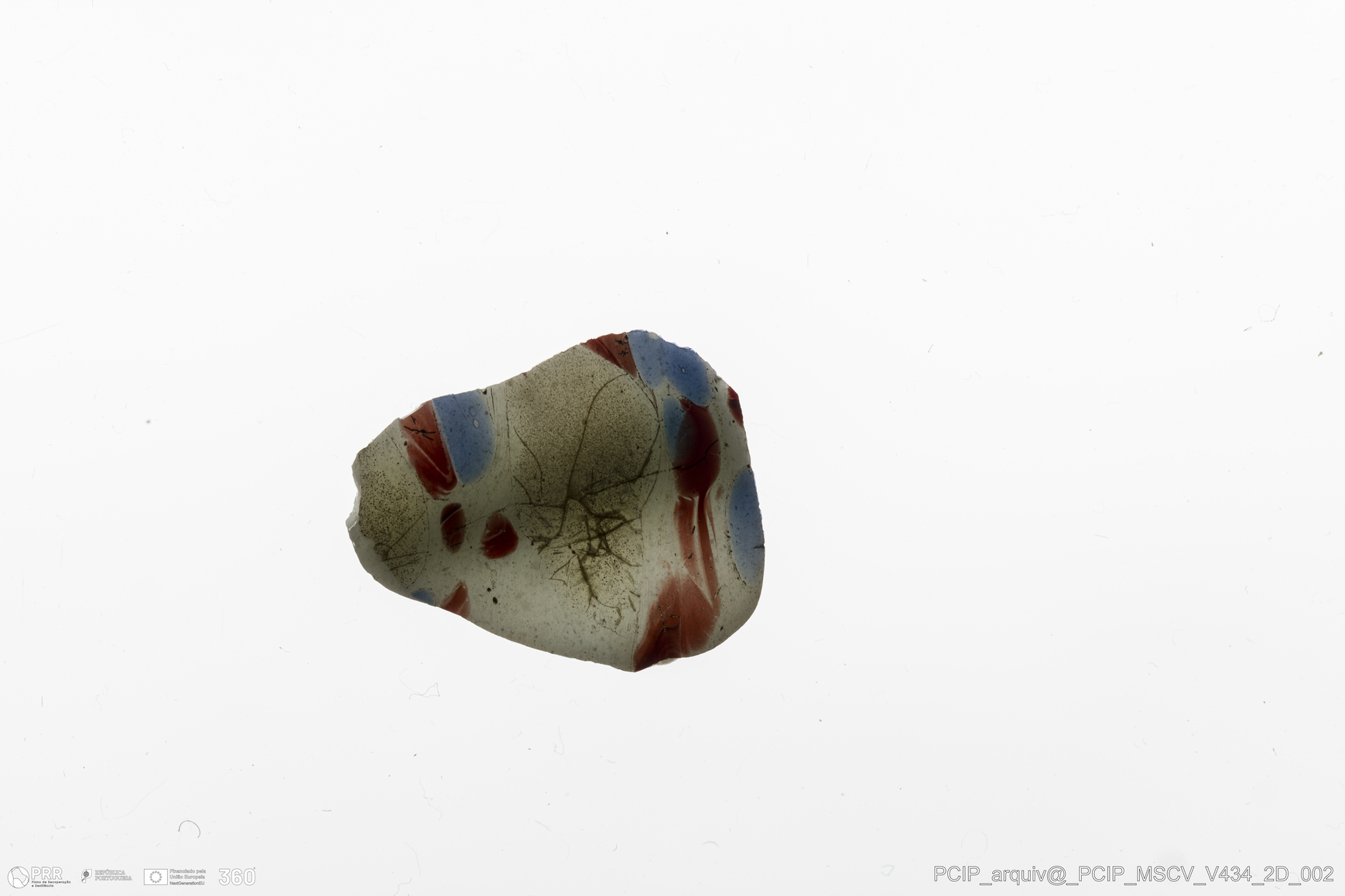 Matéria/Técnica: Vidro; Cronologia: Século XVII; Autoria: Desconhecida; Dimensões: Comprimento: 17mm; Largura: 15mm.