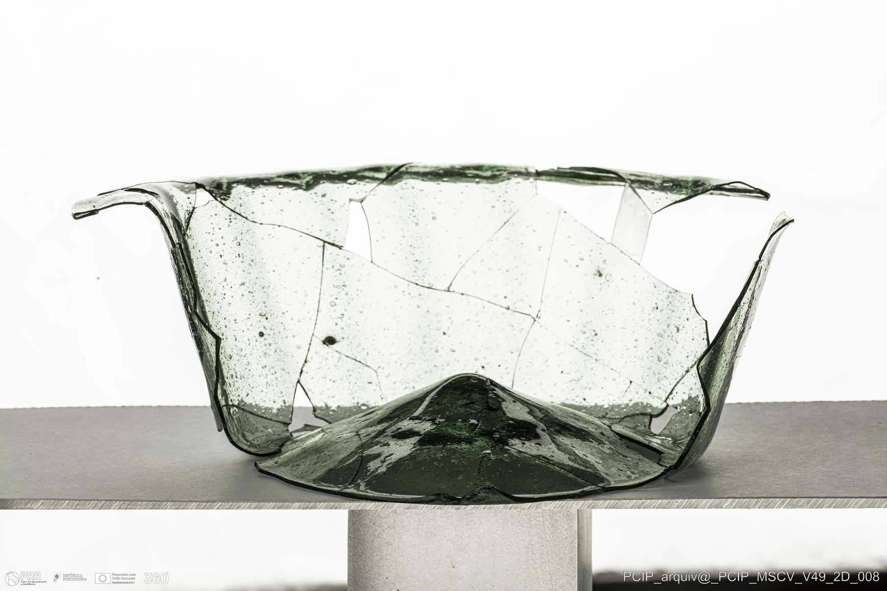 Matéria/Técnica: Vidro; Cronologia: Século XVII; Autoria: Desconhecida; Dimensões: Diâmetro bordo: 170mm; Diâmetro base: 95mm; Altura: 60mm.