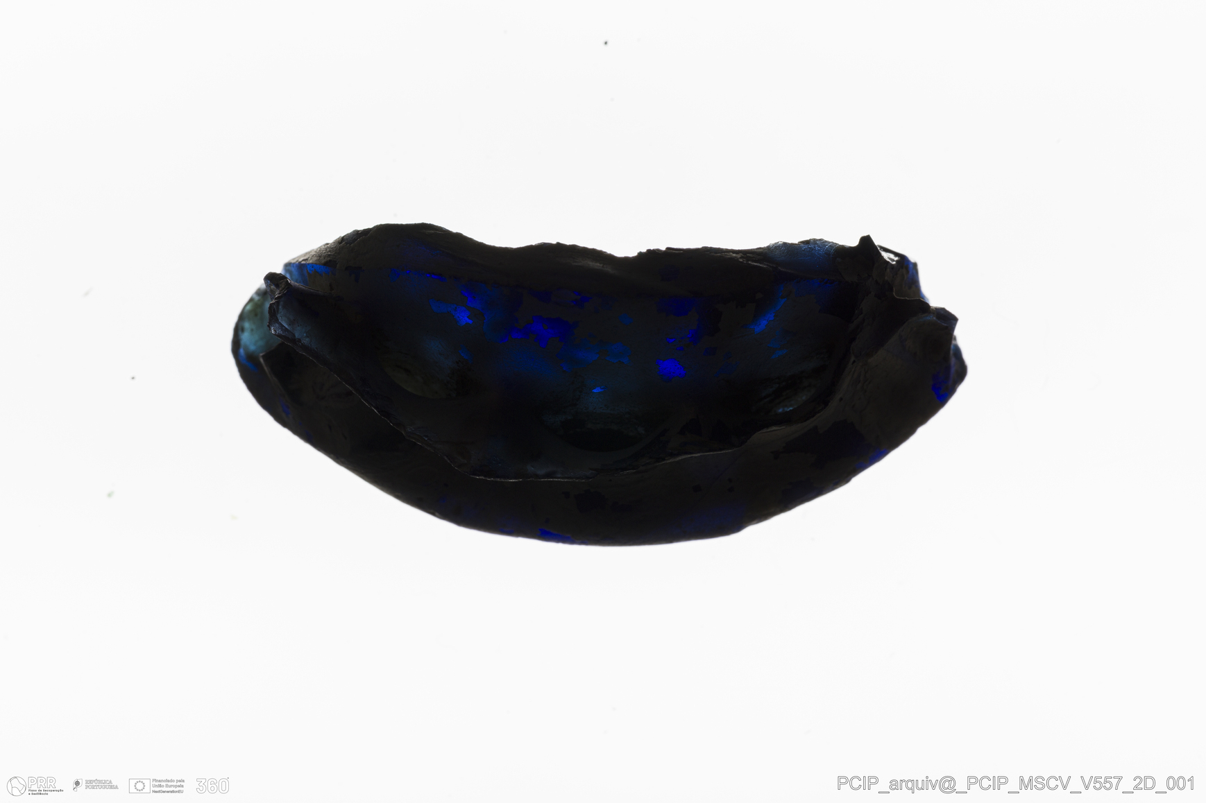 Matéria/Técnica: Vidro; Cronologia: Século XVII; Autoria: Desconhecida; Dimensões: comprimento: 50mm; Largura: 27mm.