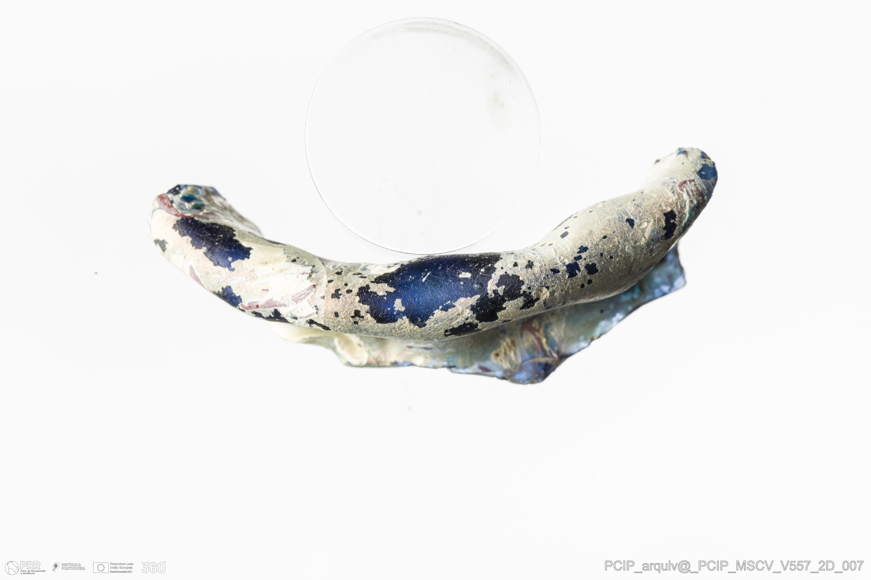 Matéria/Técnica: Vidro; Cronologia: Século XVII; Autoria: Desconhecida; Dimensões: comprimento: 50mm; Largura: 27mm.