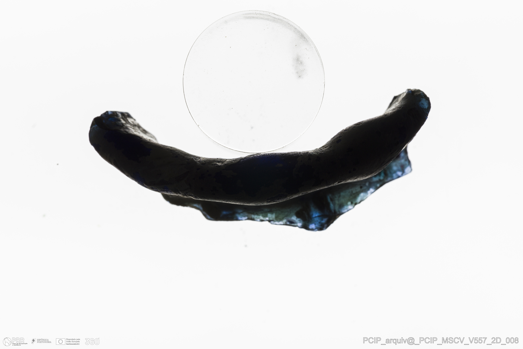 Matéria/Técnica: Vidro; Cronologia: Século XVII; Autoria: Desconhecida; Dimensões: comprimento: 50mm; Largura: 27mm.