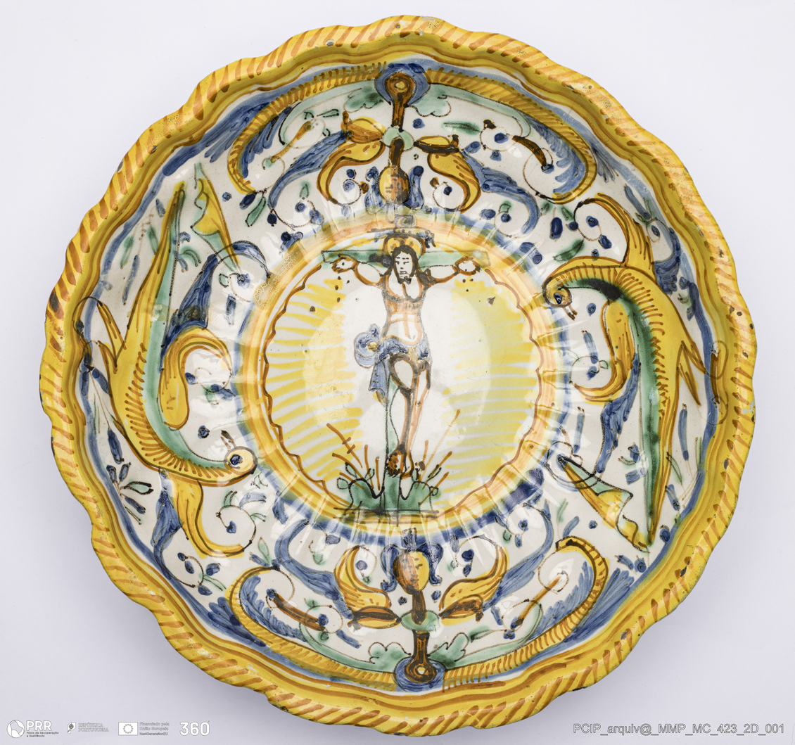 Matéria/Técnica: Majólica moldada. Vidrado polícromo: amarelo, azul, verde. E branco anilado; Cronologia: 1560-1570; Autoria: Urbino / Milão, Itália; Dimensões (cm): Altura: 5; Diâmetro: 25.
