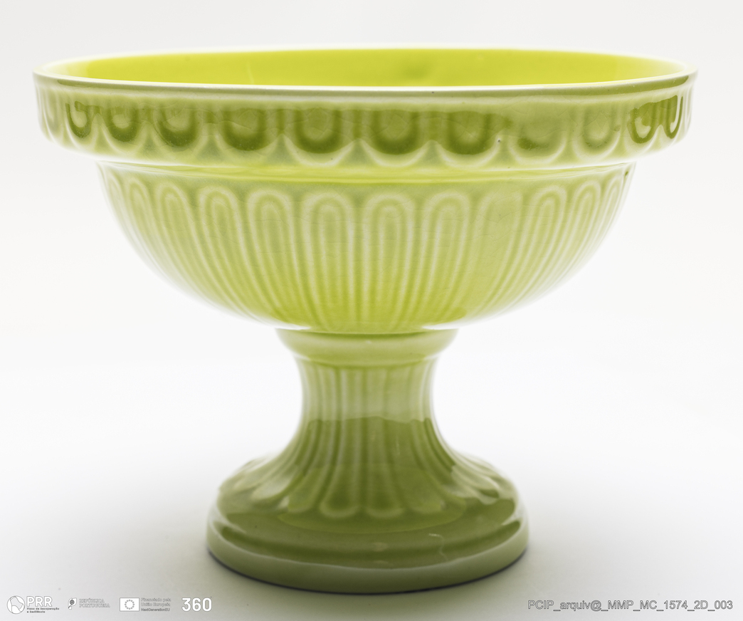 Matéria/Técnica: Pasta feldspática executada a barbotina. Vidrado verde claro; Cronologia: século XX; Autoria: Herculano Elias / Fábrica Secla, Caldas da Rainha, Portugal; Dimensões (cm): Altura: 12; Diâmetro:12,5.