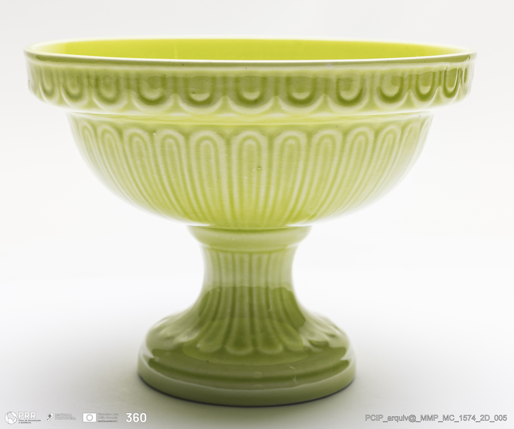 Matéria/Técnica: Pasta feldspática executada a barbotina. Vidrado verde claro; Cronologia: século XX; Autoria: Herculano Elias / Fábrica Secla, Caldas da Rainha, Portugal; Dimensões (cm): Altura: 12; Diâmetro:12,5.