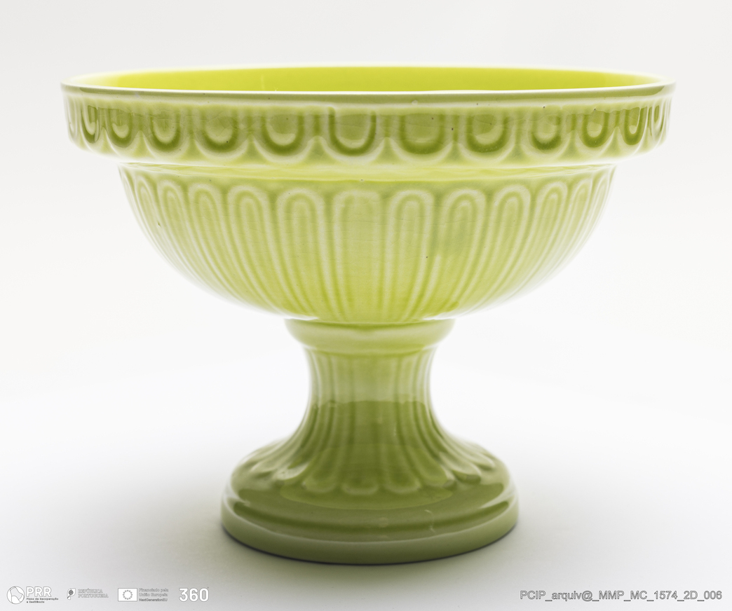 Matéria/Técnica: Pasta feldspática executada a barbotina. Vidrado verde claro; Cronologia: século XX; Autoria: Herculano Elias / Fábrica Secla, Caldas da Rainha, Portugal; Dimensões (cm): Altura: 12; Diâmetro:12,5.
