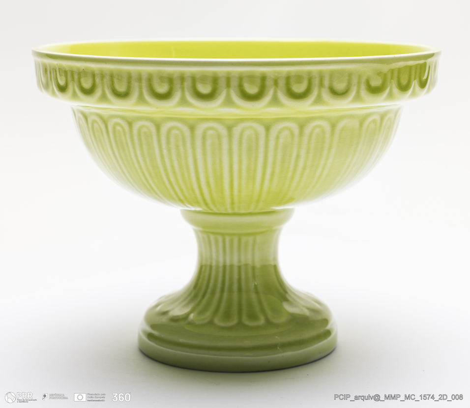 Matéria/Técnica: Pasta feldspática executada a barbotina. Vidrado verde claro; Cronologia: século XX; Autoria: Herculano Elias / Fábrica Secla, Caldas da Rainha, Portugal; Dimensões (cm): Altura: 12; Diâmetro:12,5.