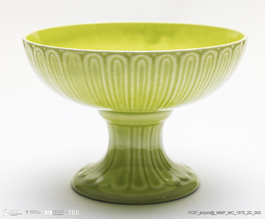 Matéria/Técnica: Pasta de faiança feldspática executada a barbotina. Vidrado verde claro; Cronologia: século XX; Autoria: Herculano Elias / Fábrica Secla, Caldas da Rainha, Portugal; Dimensões (cm): Altura: 9; Diâmetro:13.