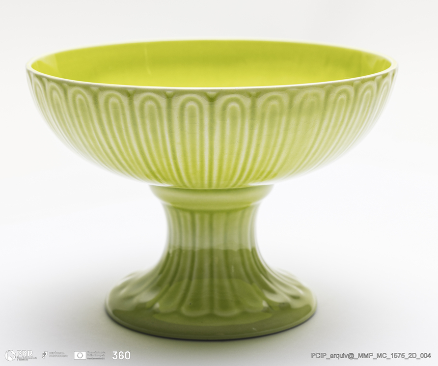 Matéria/Técnica: Pasta de faiança feldspática executada a barbotina. Vidrado verde claro; Cronologia: século XX; Autoria: Herculano Elias / Fábrica Secla, Caldas da Rainha, Portugal; Dimensões (cm): Altura: 9; Diâmetro:13.