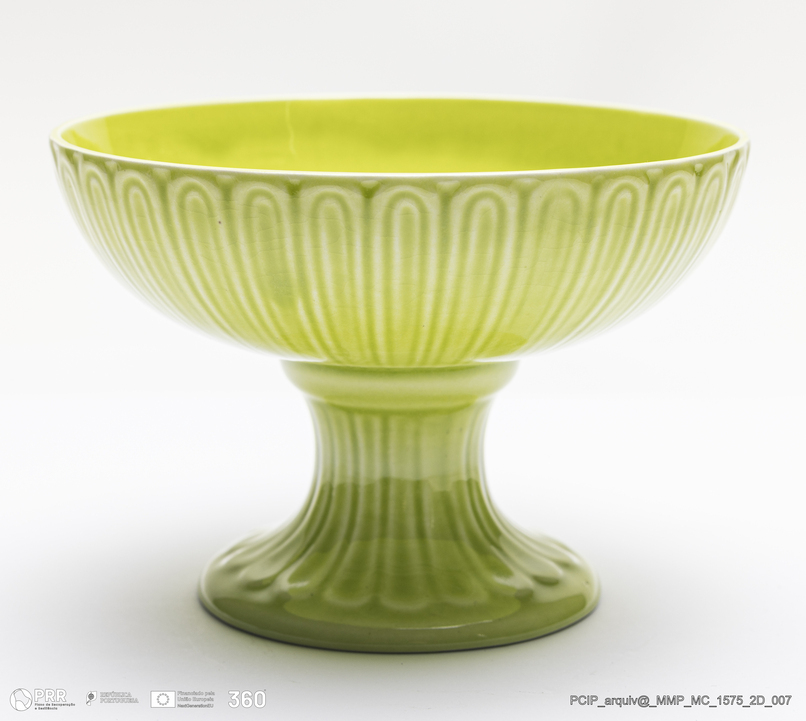 Matéria/Técnica: Pasta de faiança feldspática executada a barbotina. Vidrado verde claro; Cronologia: século XX; Autoria: Herculano Elias / Fábrica Secla, Caldas da Rainha, Portugal; Dimensões (cm): Altura: 9; Diâmetro:13.
