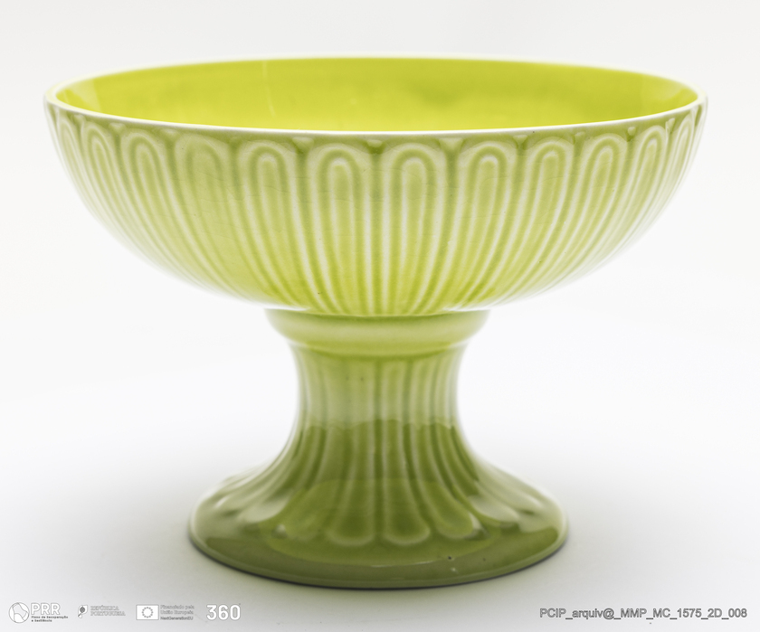 Matéria/Técnica: Pasta de faiança feldspática executada a barbotina. Vidrado verde claro; Cronologia: século XX; Autoria: Herculano Elias / Fábrica Secla, Caldas da Rainha, Portugal; Dimensões (cm): Altura: 9; Diâmetro:13.