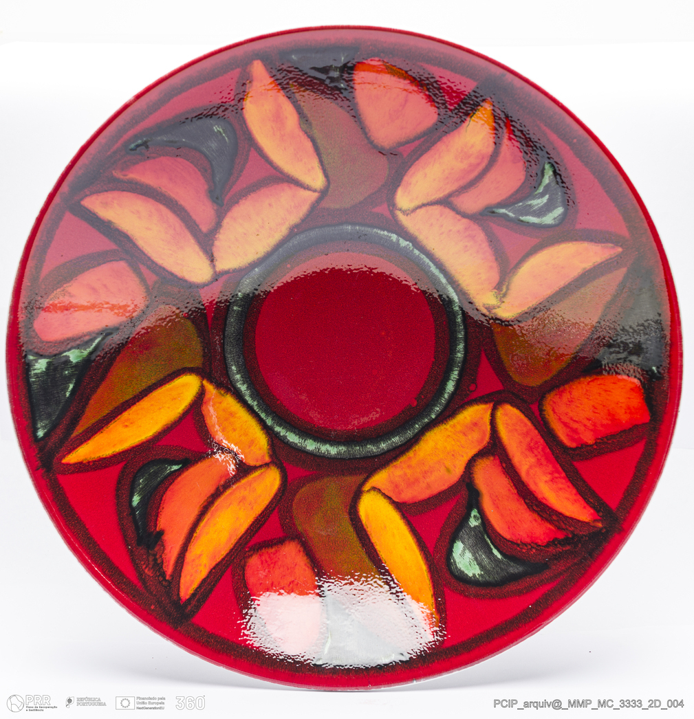 Matéria/Técnica: Barro branco rodado. Vidrado polícromo: preto, vermelho, laranja, verde, amarelo e branco; Cronologia: 1970; Autoria: Tony Morris e Loretta Leight / Poole, Inglaterra; Dimensões (cm): Altura: 9; Diâmetro:34,5.
