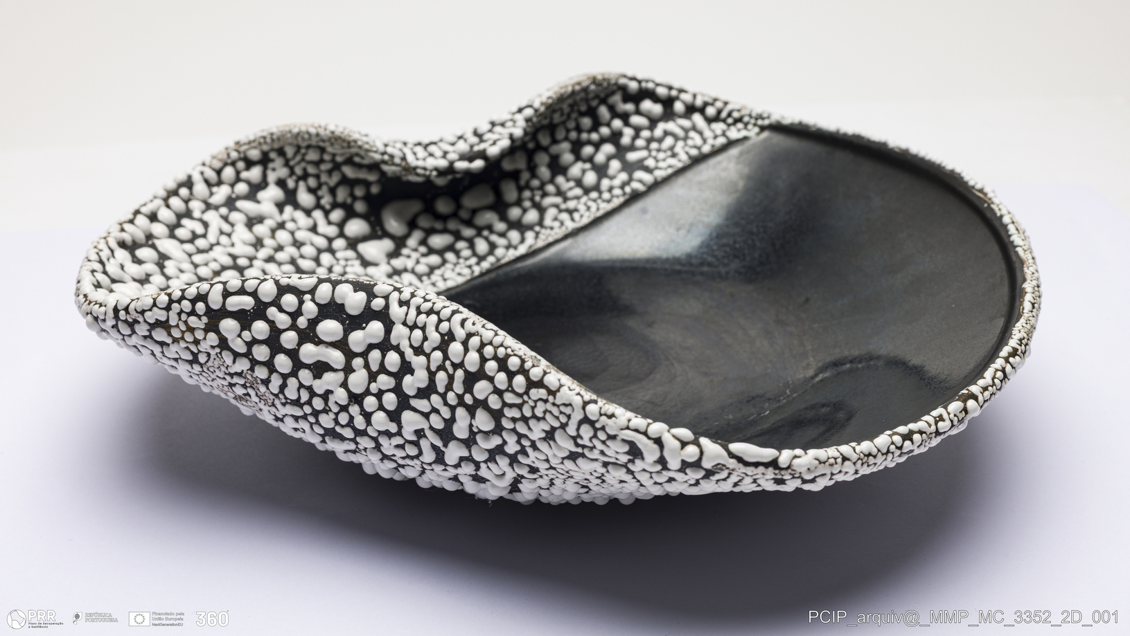 Matéria/Técnica: Barro vermelho rodado e moldado. Vidrado polícromo mate: preto e branco; Cronologia: Século XX; Autoria: Desconhecido /Áustria; Dimensões (cm): Altura: 7; Largura: 23,5; Comprimento: 235.